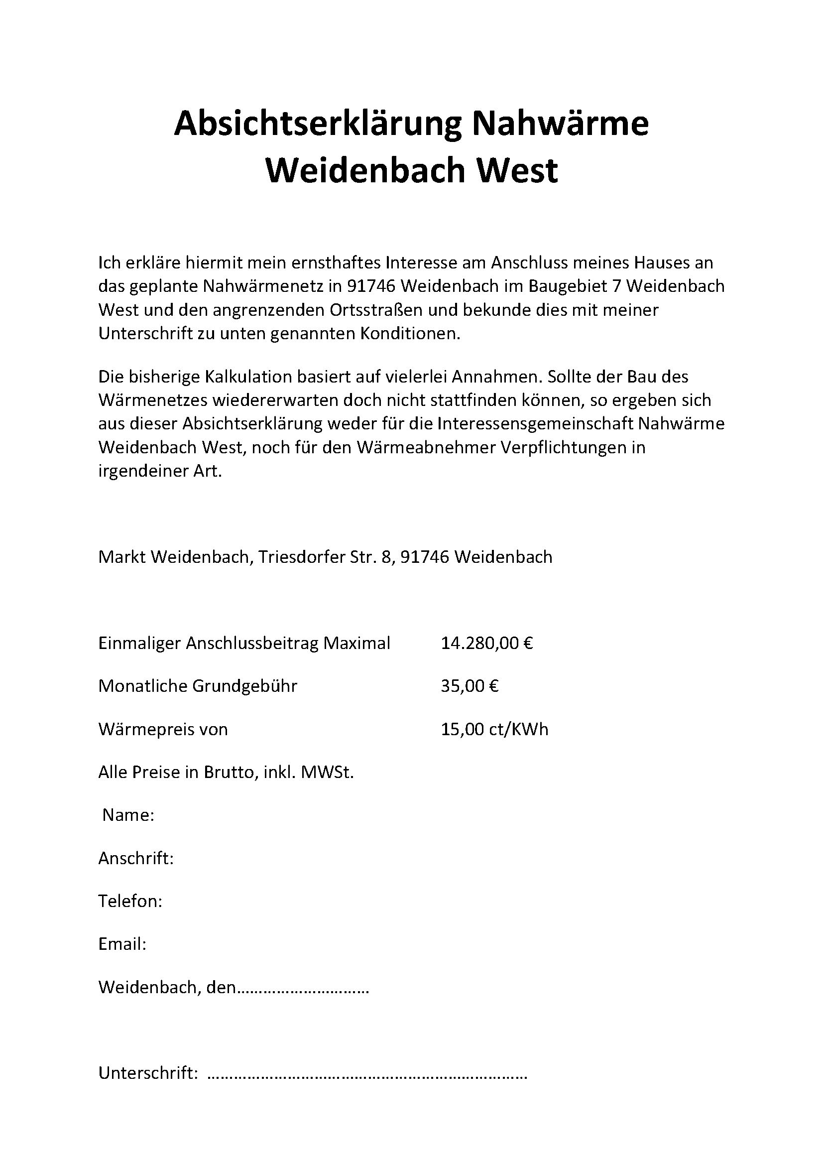 Damit das Projekt im Baugebiet 7 sicher realisiert werden kann, brauchen wir möglichst viele Mitbürger, die Ihre Häuser an das Nahwärmenetz anschließen wollen. Um uns dies Mitzuteilen können Sie die nachfolgende Absichtserklärung unterschrieben an das Rathaus zurückgeben.